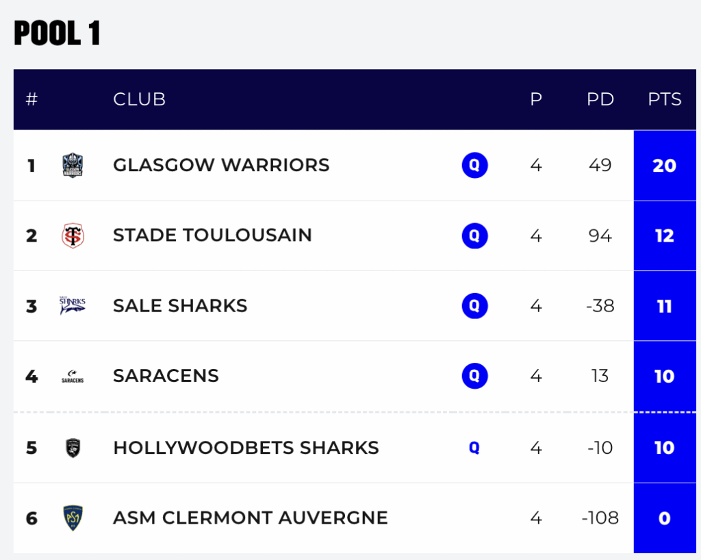 *The Sharks hammered a second rate Clermont 50-12 in Durban, which was not enough to get them to the last 16 of the Champions Cup. The Sharks won two from four matches, but such was the competitive nature of the Pool, that Toulouse, with two wins from four, would finished ahead of them. A fifth place finish relegates the Sharks to the EPCR Challenge Cup, which they won two seasons ago.