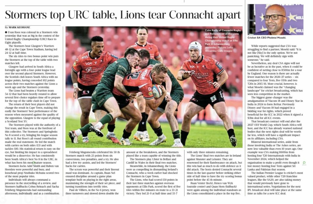 Scottish media reaction to the Stormers’ 48-12 win over Glasgow, analysing how the result sent the Cape side to the top of the URC table.